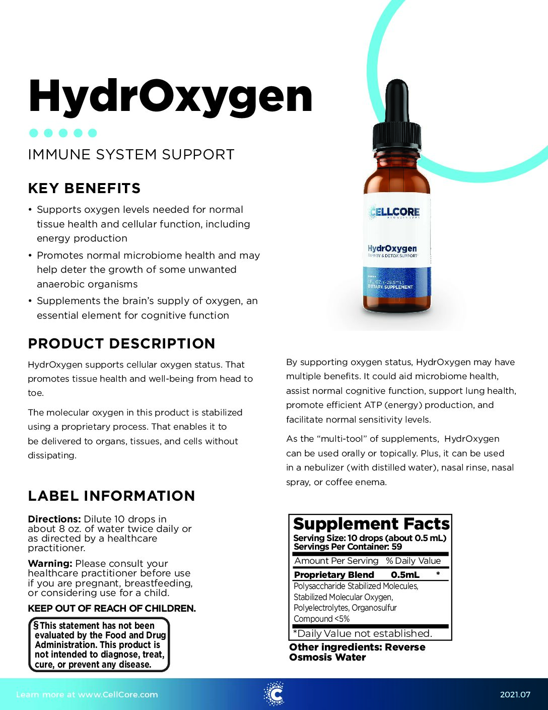 Cellcore HydrOxygen is a breakthrough liquid supplement designed to rapidly deliver bioavailable oxygen at the cellular level. By supporting oxygen uptake and utilization, this innovative formula helps optimize cellular energy, enhance natural detoxification, and promote resilience against oxidative stress. Oxygen is fundamental for vitality, and HydrOxygen provides an efficient way to help replenish and sustain this critical element for whole-body performance, recovery, mitochondrial efficiency and wellness. Features high conductivity and low pH for optimal oxygen transfer, cellular health and nutrient delivery.