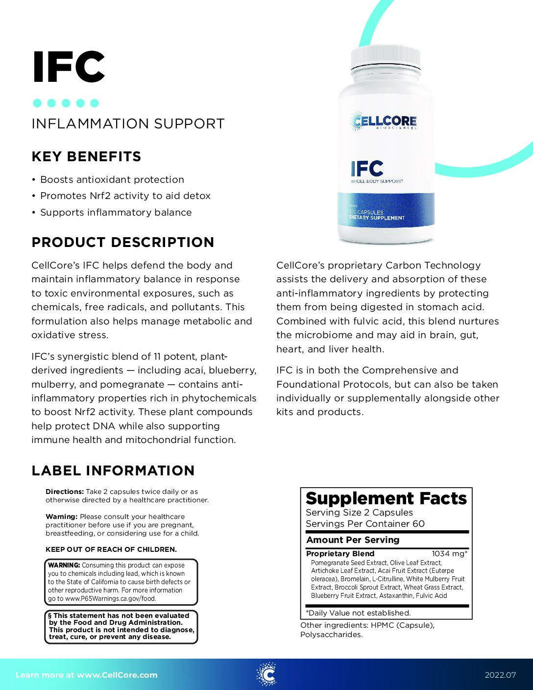 CellCore IFC contains eleven herbs and botanicals — including astaxanthin, blueberry, bromelain, mulberry, pomegranate and wheatgrass — to support the body’s anti-inflammatory pathways and natural detoxification processes, promoting system balance. The addition of Carbon Technology supports cellular renewal and repair, as well as healthy mitochondrial function, for additional immune, detoxification, and drainage support.
