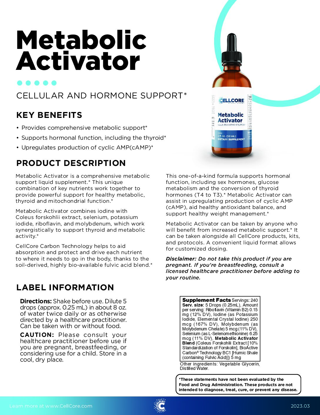 Metabolic Activator by Cellcore is a new comprehensive metabolic support supplement. This unique combination of key nutrients work together to provide powerful support for healthy metabolic, thyroid and mitochondrial function.*
