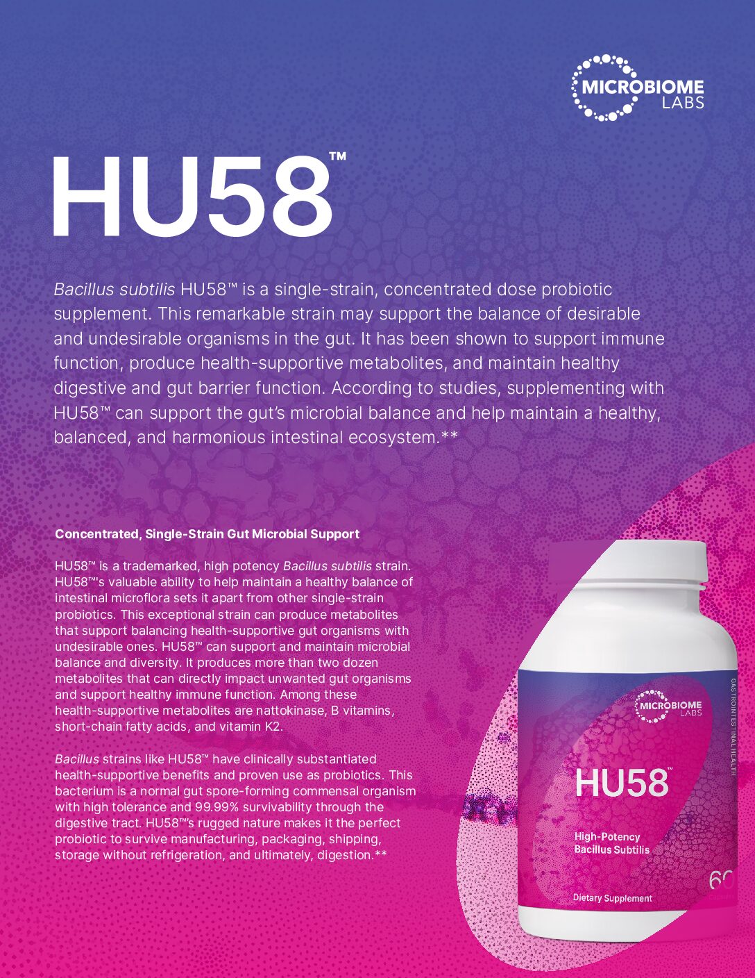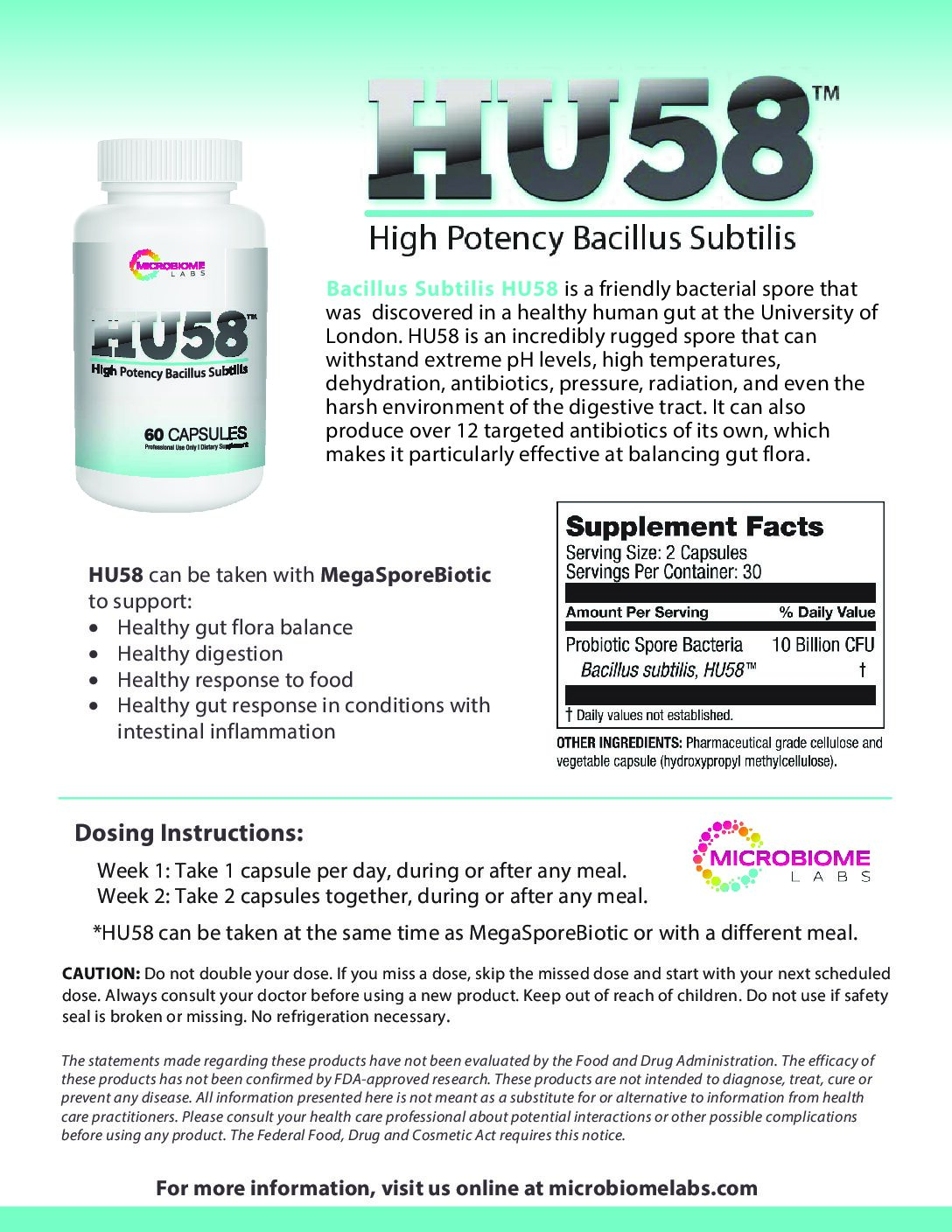 HU58 from Microbiome Labs is a single-strain probiotic with a concentrated dose of Bacillus subtilis. HU58 was formulated to support a healthy immune function and maintain a healthy balance of intestinal microflora.* HU58 is an incredibly rugged spore that can withstand extreme pH levels, high temperatures and the harsh environment of the digestive tract. HU58 from Microbiome Labs is a Single-strain dairy free probiotic. Bacillus subtilis can produce over 12 targeted antibiotics of its own, which makes it particularly effective at balancing gut flora. Bacillus Subtilis HU58 is a friendly bacterial spore that was discovered in a healthy human gut at the University of London.