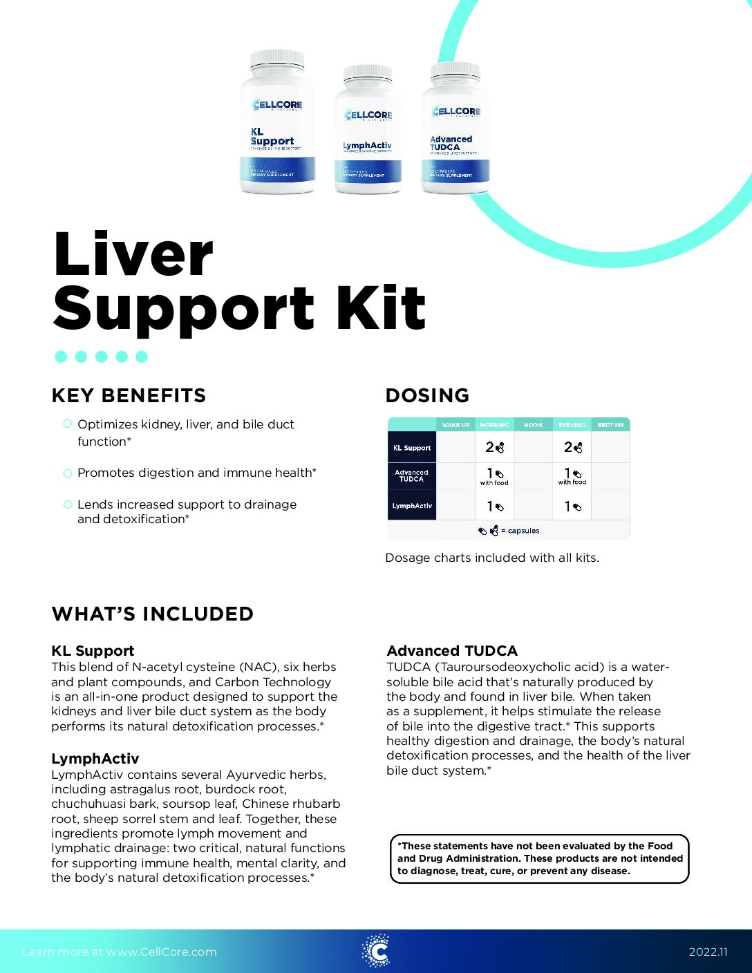The supplements in the Liver Support Kit by Cellcore lend increased support to the body’s drainage pathways and natural detoxification processes. This kit is ideal for any patient looking to optimize their digestion, liver and immune health. Each supplement supports healthy kidney, liver, and bile duct function, as well as promotes lymph movement and lymphatic drainage.