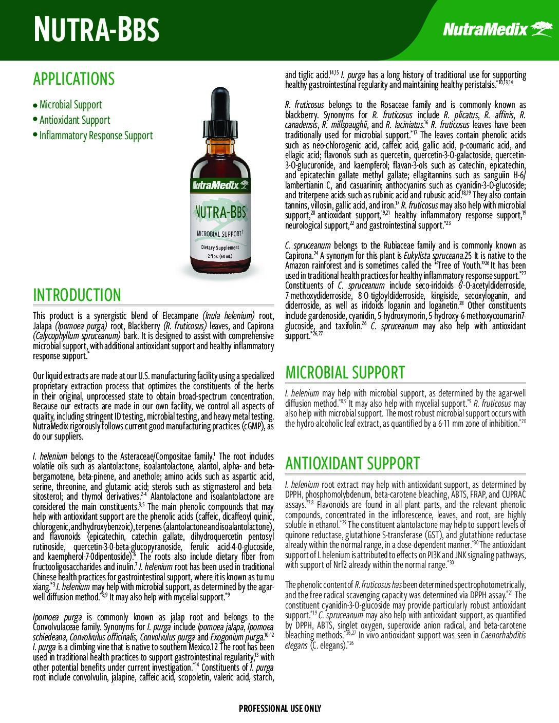 Nutra-BBS is designed to assist with comprehensive microbial support, with additional antioxidant support and healthy inflammatory response support. Besides their anti-inflammatory potential, their cytotoxicity, structure-activity relationships and pharmacokinetics have been investigated. Compounds support their ability to target and inhibit various key pro-inflammatory molecules enrolled in diverse inflammatory pathways.